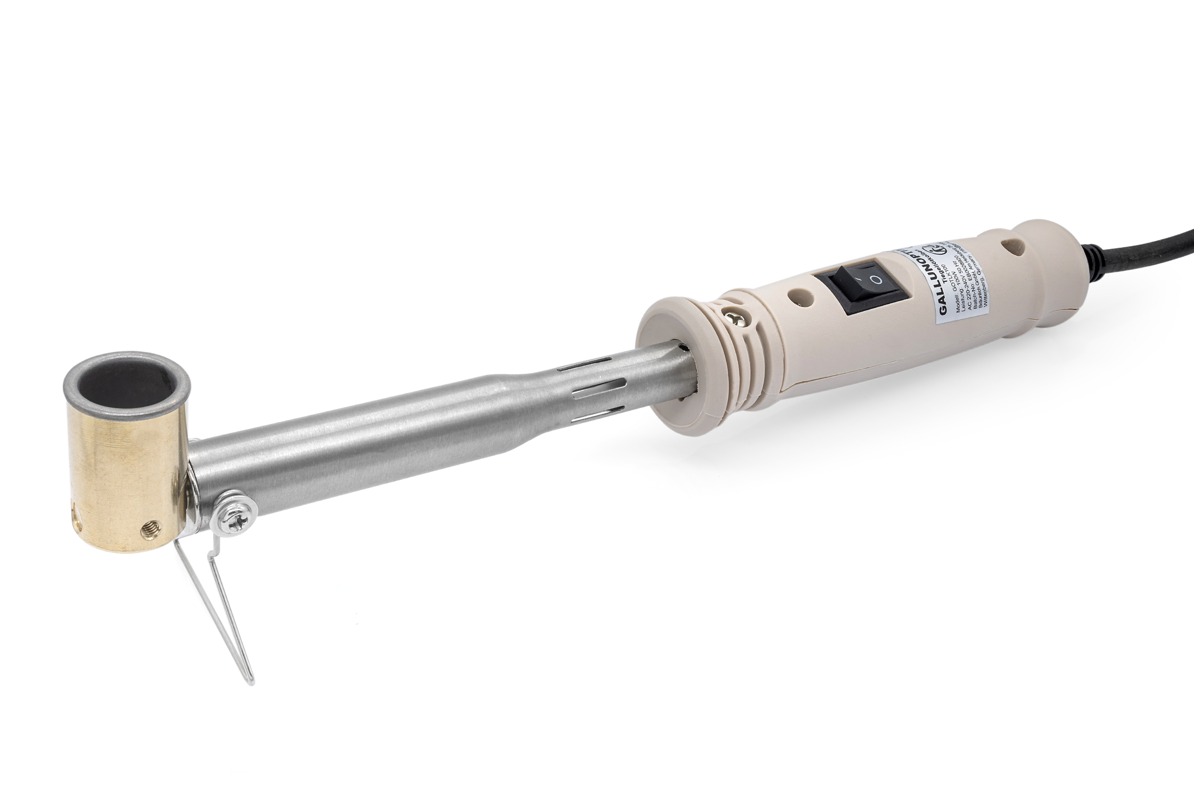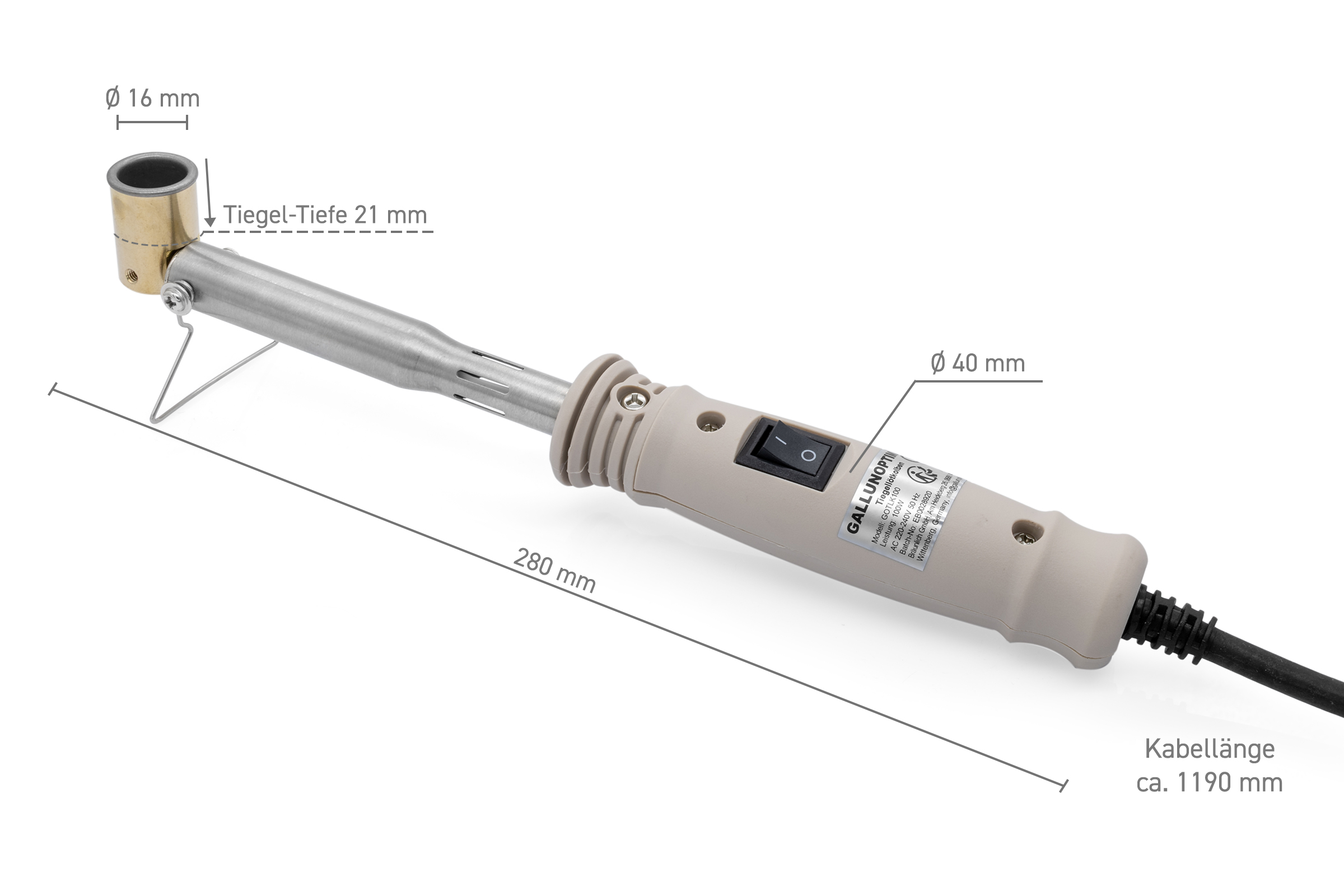 Der GALLUNOPTIMAL Tiegellötkolben ist eine praktische Lösung für Lötarbeiten, bei denen kleine Werkstücke, Drahtenden oder Kontakte schnell und gleichmäßig mit flüssigem Lötzinn benetzt werden sollen. Mit 230 V Netzbetrieb und 100 W Leistung eignet sich das Gerät für den stationären Einsatz in Werkstatt, Service, Elektronikfertigung und Kabelkonfektion. Der Schalter direkt am Griff ermöglicht eine einfache und direkte Bedienung im Arbeitsalltag.